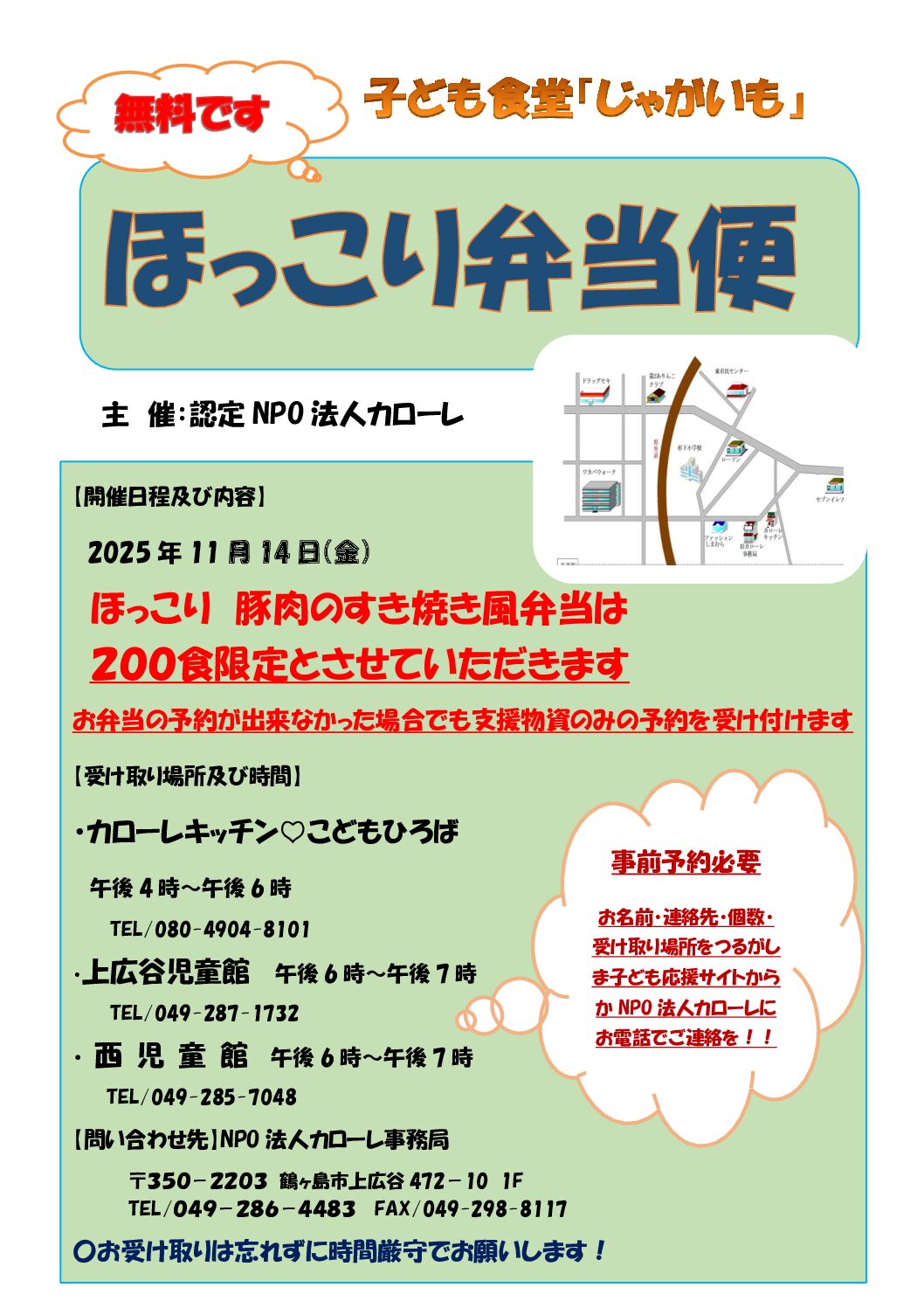 上広谷児童館・西児童館へ学習支援に来ている子どもたちや、鶴ヶ島市内にお住いのご家庭に、ほっこり弁当を配付します!